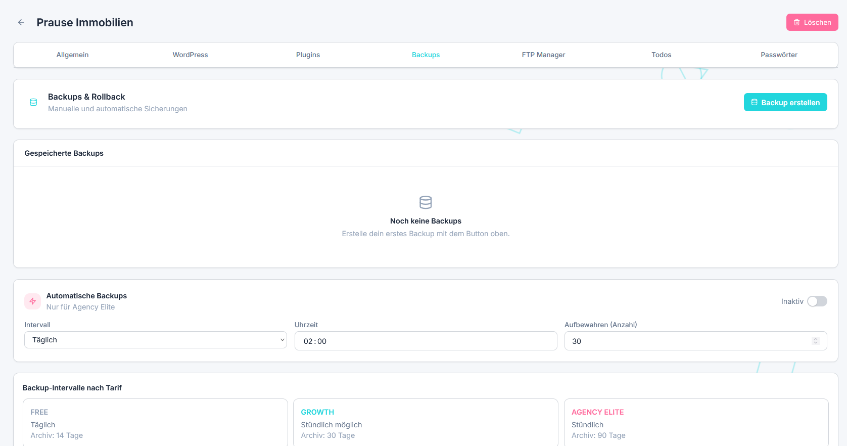 Automatische Backups und Sicherheits-Monitoring für alle deine Websites.